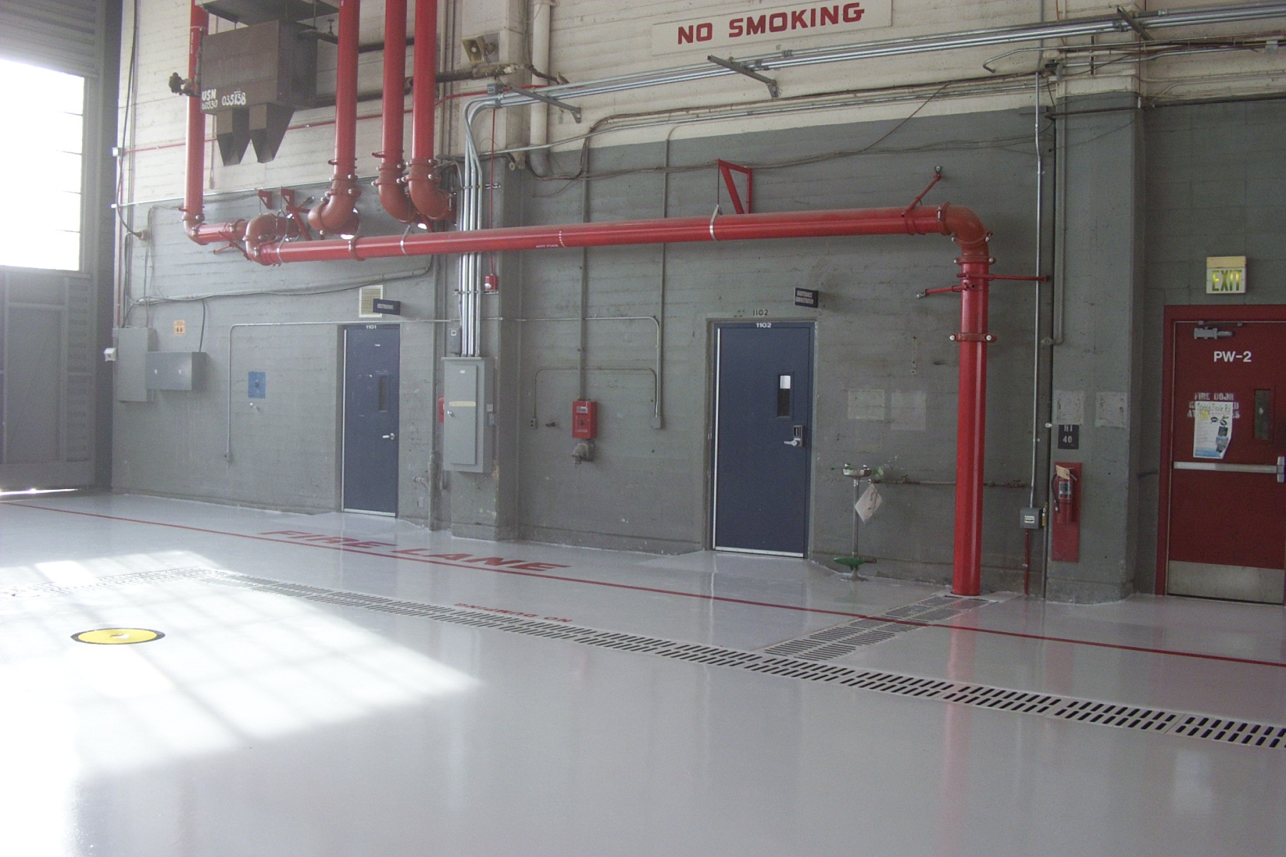 - Project managed the design and build of new fire protection and alarm system utilizing Viking grate nozzle technology for AFFF distribution within Hangar 1 at NAWS China Lake. The overhead deluge water sprinkler system was demolished and replaced with an overhead wet sprinkler system. The existing 16” thick hangar floor was demolished and replaced with a new monolithically cast-in-place concrete hangar floor to accommodate the new AFFF grate nozzle system. A new static grounding system was installed within the new hangar floor. A new underground, high-pressure water distribution system was installed for the flow control and alarm valves within the newly built and customized AFFF building. Within the AFFF building, both overhead and AFFF support equipment including piping, fittings, valves, and AFFF tanks were installed within an environmentally controlled environment.